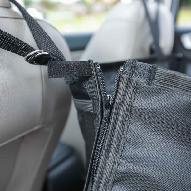Possui zíperes dos dois lados para você poder abrir e facilitar a entrada e saída do seu pet. Os zíperes abrem de ambos os lados, de modo que os zíperes ao serem abertos se encontram no meio. A aba desta forma, uma vez aberta, protegerá a parte de baixo do banco e também a lataria do carro quando o cachorro for subir. Após o cachorro subir, basta fechar os zíperes e pronto! A capa protegerá as portas.