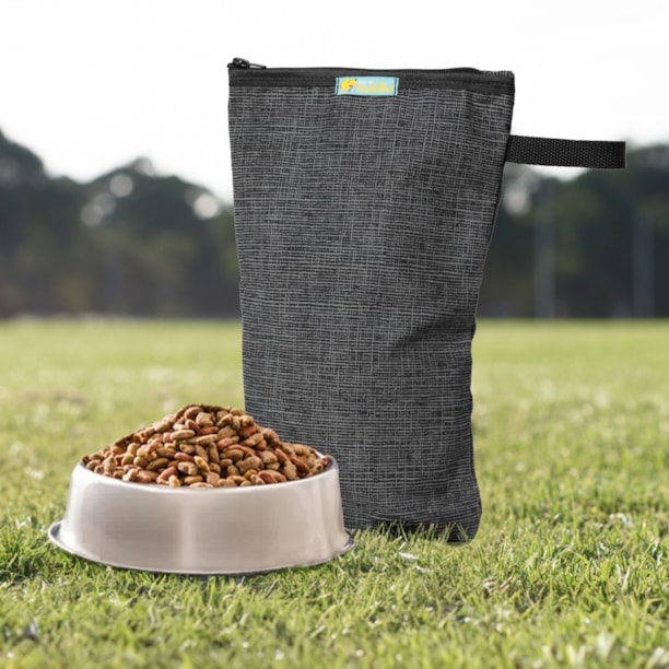Feito com tecido emborrachado, ele protege a ração da umidade e por não ser rígido, cabe em qualquer cantinho no carro ou nas malas de viagem.