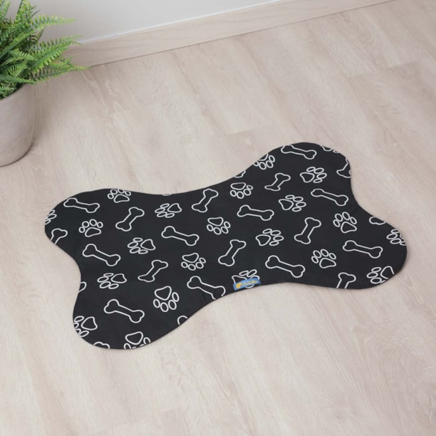 O tapete para cães é lindo e muito prático. Confeccionado com fundo impermeável, é muito útil para deixar embaixo do pratinho de água e comida do seu cãozinho.